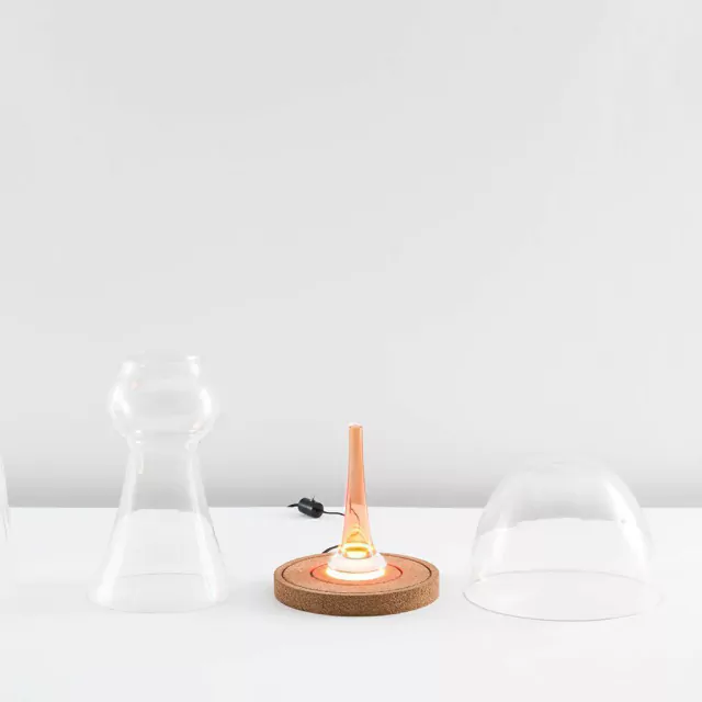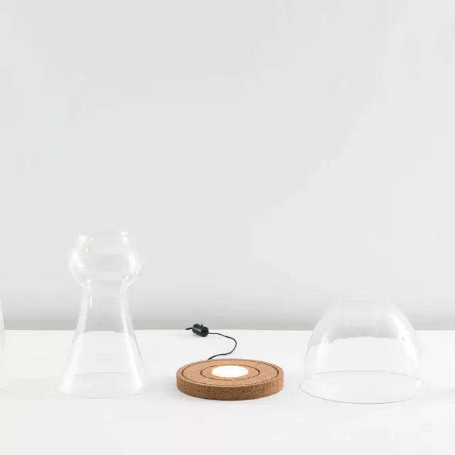 Formas antigas de vidros soprados artesanalmente utilizados individualmente ou em sobreposições com várias combinações diferentes. Possuem como elemento de identidade a cortiça natural. O resgate da memória aplicado no design contemporâneo.