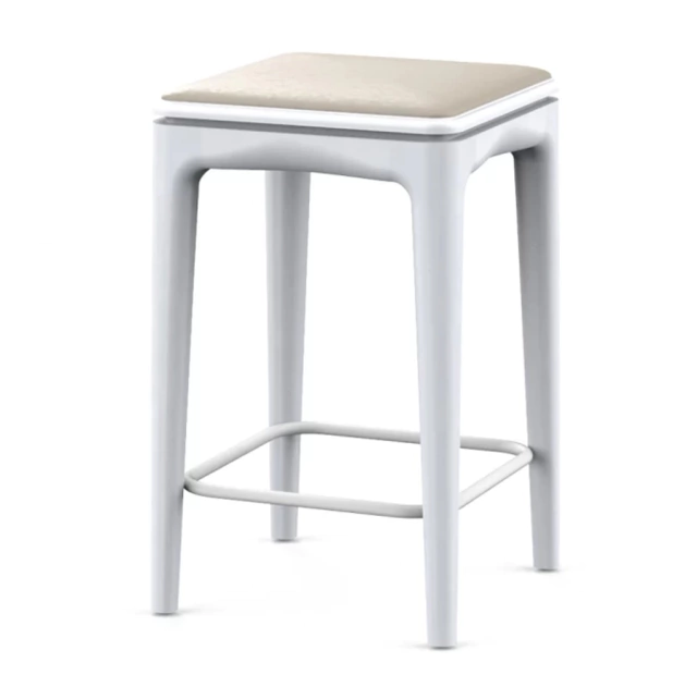 Estrutura em madeira maciça de jequitibá. Opções de assento em MDF laminado, rattan, aramida ou estofado. Assento em rattan contém reforço em tela nylon. Apoio de pés em aço carbono pintado.