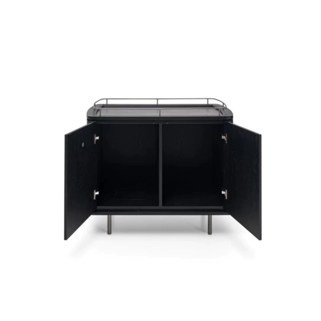 O balanço de contrastes provoca o olhar. A peça é, a um só tempo, sutil e marcante, delicada e forte. A estrutura em madeira maciça abriga prateleiras e gavetas em um monovolume. Pés e tampo têm um delgado contorno em metal, fazendo o peso visual levitar.