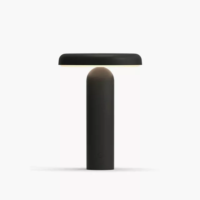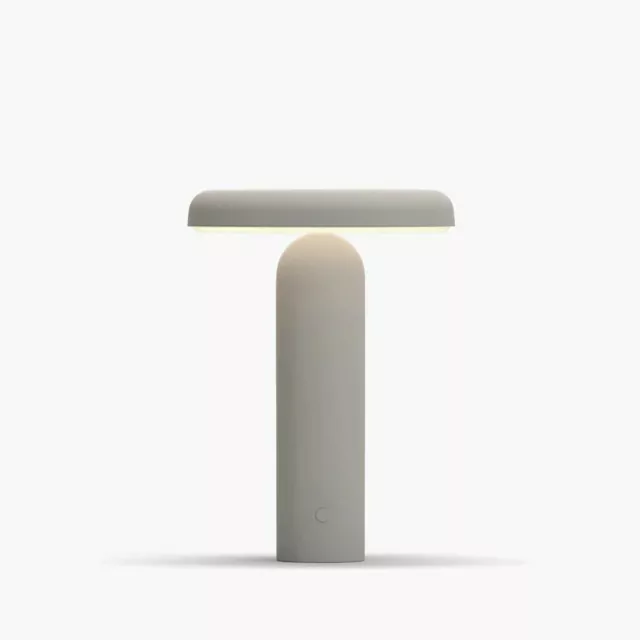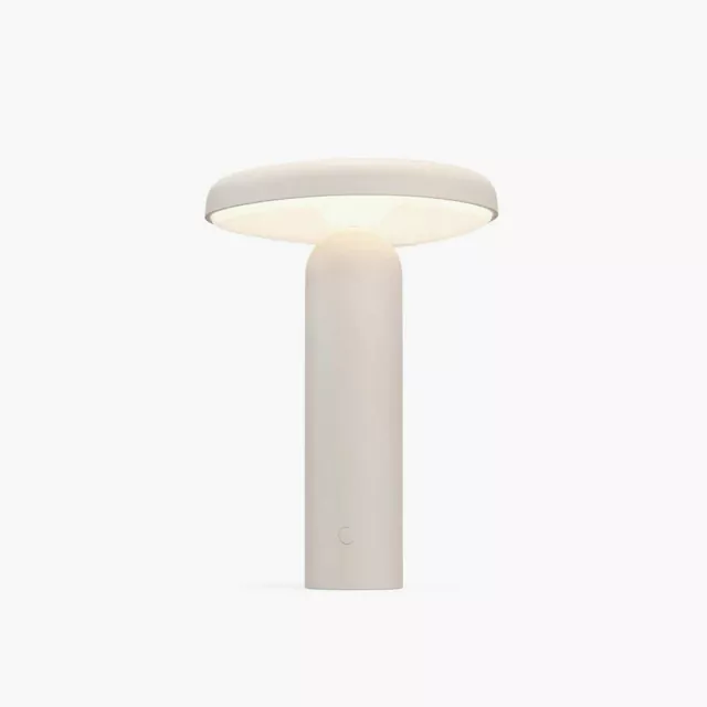 Luminária portátil com bateria recarregável e luz difusa. Estrutura em alumínio com pintura líquida fosca e verniz soft-touch (versões Off White, Off Black e Cimento); ou verniz brilho (versão Café). Botão na base permite dimerizar a luz em 3 níveis. Difusor de acrílico. LED integrado. Porta USB-C. Carregador e cabo USB-C inclusos.