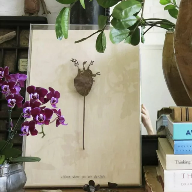 Quadro feito com madeira de reflorestamento e escultura em ferro e moldura de acrílico.